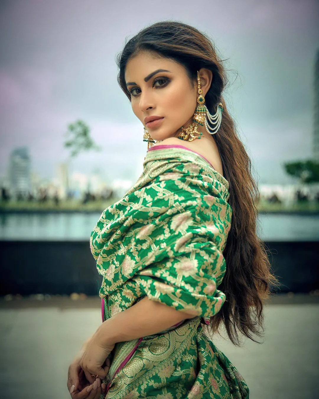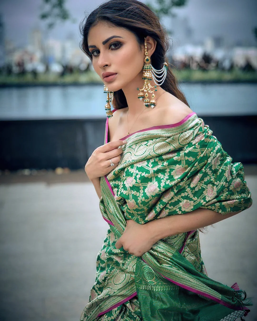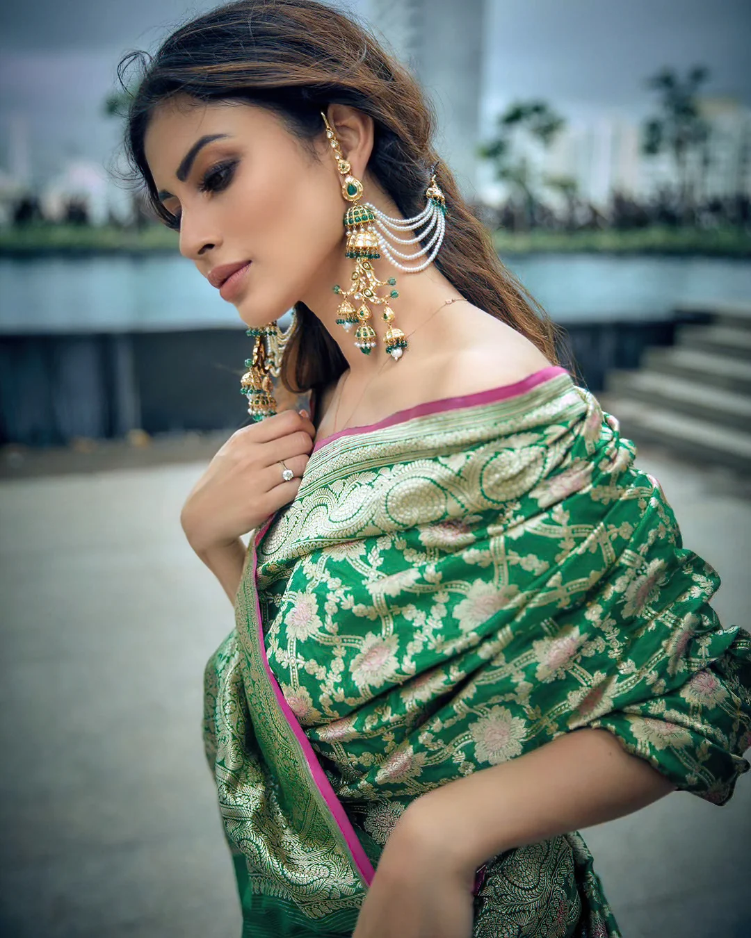 Naagin Actress Mouni has appeared in a saree after a long time and she is looking very beautiful in this green saree photoshoot.